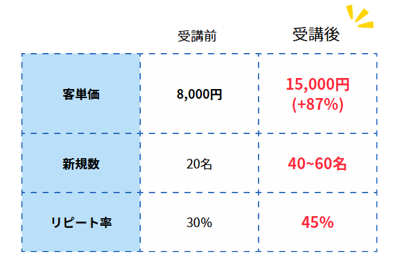 提案水準が上がることはもちろんのこと、スタイリストになるまでの期間の短縮・早期100万円売上到達・店舗ブランディング・新規集客増加・単価UP・競合差別化など様々な効果、実績があります。