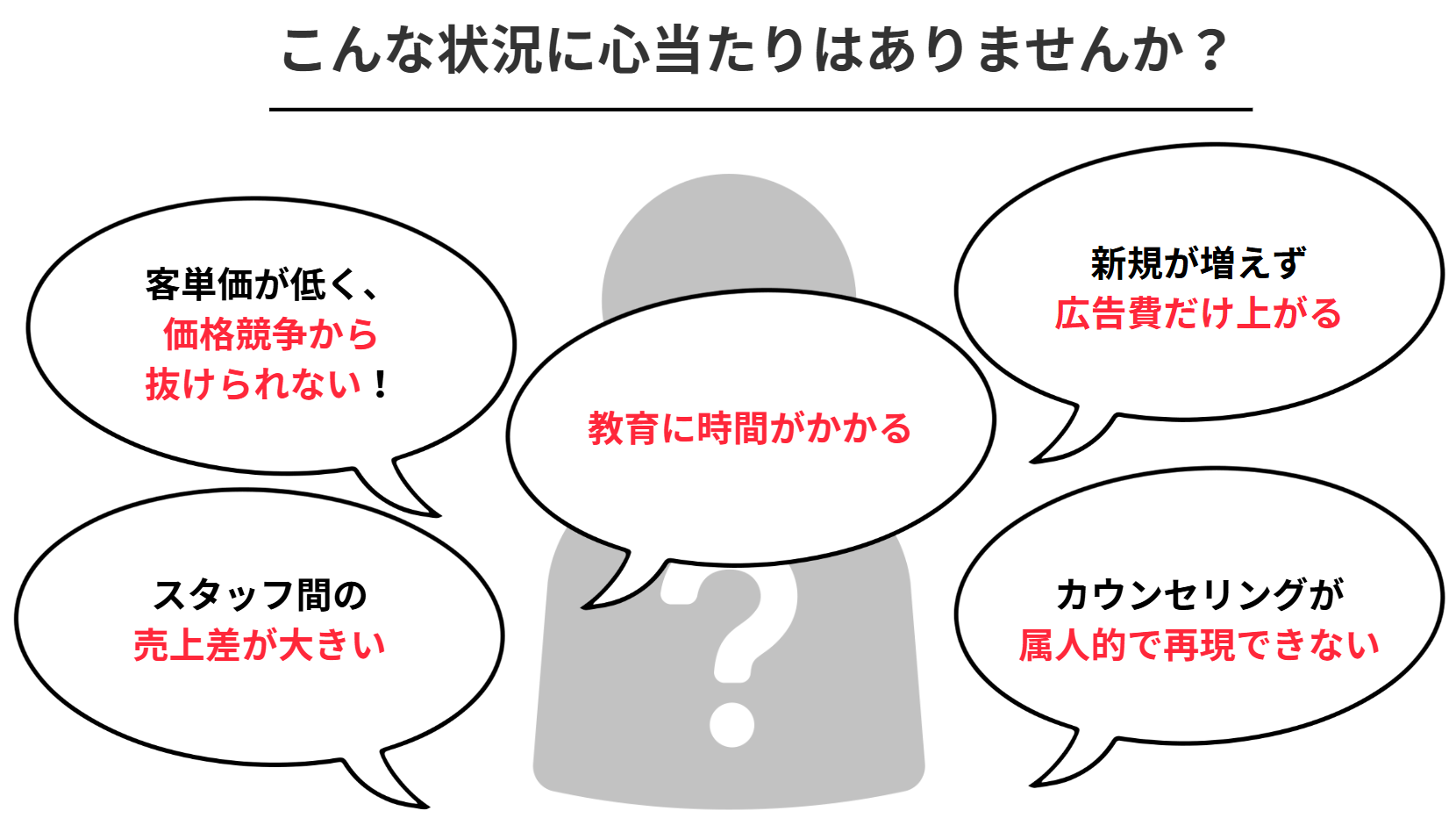 メインは、診断×カウンセリング×提案ストーリー構築です。技術講習ではなく、客単価・指名・リピートを上げる、「売上UPの仕組み」をつくります。
